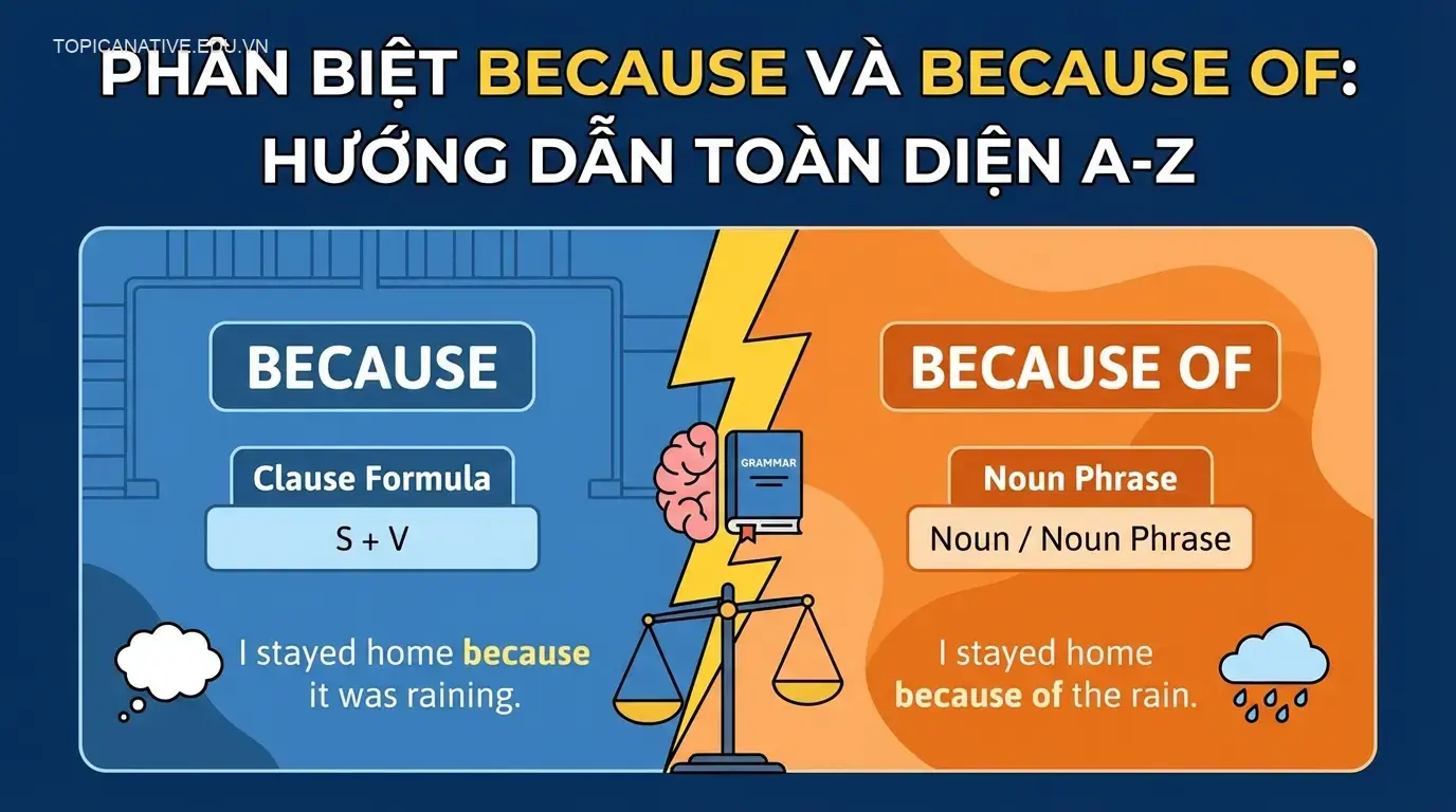 Sự khác biệt căn bản giữa “Because” và “Because of” nằm ở cấu trúc ngữ pháp theo sau chúng: Because là một liên từ (conjunction) bắt buộc phải đi cùng một mệnh đề hoàn chỉnh (chủ ngữ + động từ), trong khi Because of là một cụm giới từ (prepositional phrase) chỉ đi cùng một danh từ, cụm danh từ hoặc V-ing. Việc nắm vững quy tắc này là chìa khóa để diễn đạt nguyên nhân một cách chính xác và chuyên nghiệp trong tiếng Anh. Bài viết này sẽ phân tích chi tiết công thức, các lỗi sai kinh điển, và những cấu trúc thay thế hiệu quả để bạn tự tin áp dụng trong mọi tình huống công việc và giao tiếp.