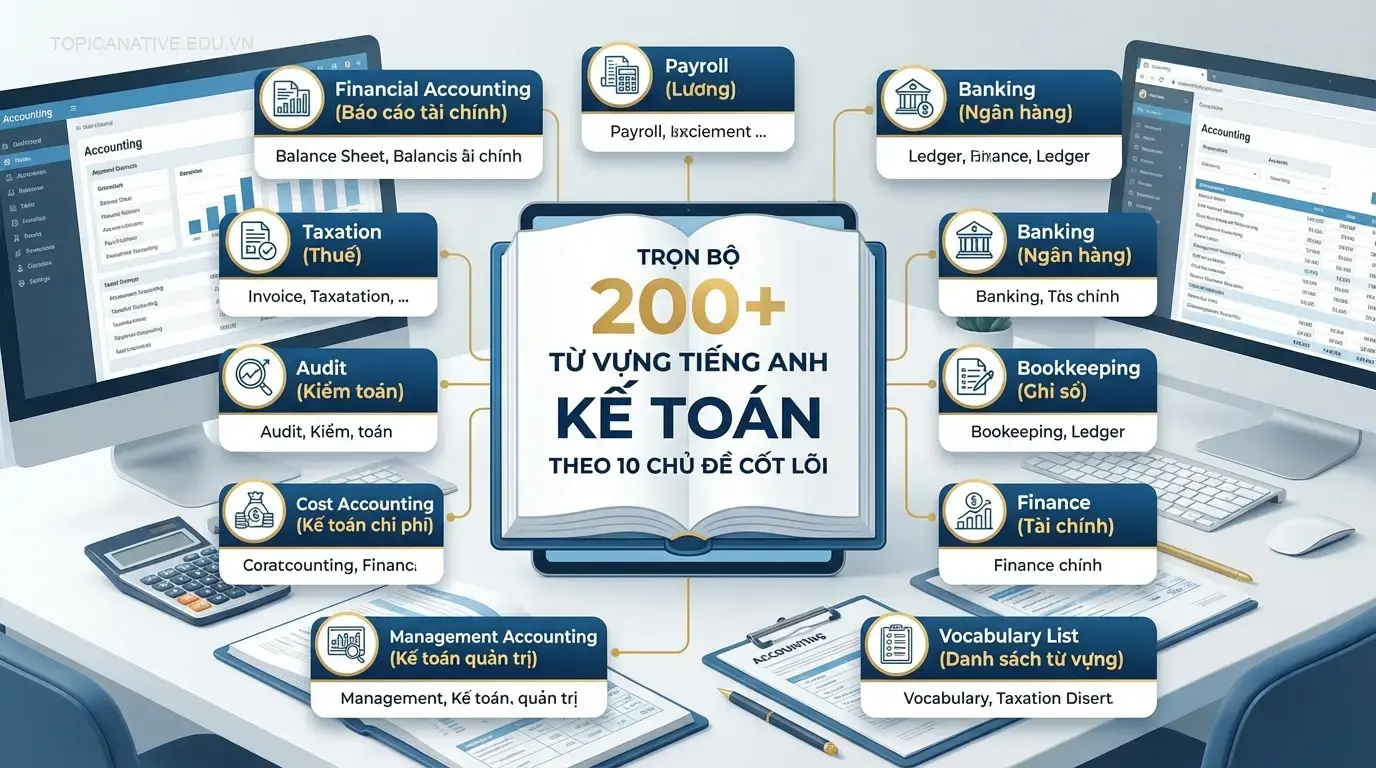 Tiếng Anh chuyên ngành Kế toán là bộ công cụ ngôn ngữ thiết yếu, giúp các chuyên gia tài chính ghi chép, phân tích và báo cáo thông tin kinh tế theo chuẩn mực quốc tế. Việc nắm vững bộ từ vựng cốt lõi không chỉ giúp xử lý công việc hiệu quả, đọc hiểu báo cáo tài chính, mà còn là chìa khóa mở ra cơ hội làm việc tại các công ty đa quốc gia và nâng cao lợi thế cạnh tranh sự nghiệp. Bài viết này tổng hợp và hệ thống hóa hơn 200 thuật ngữ quan trọng nhất, được phân loại chi tiết theo 10 chủ đề trọng tâm để bạn dễ dàng học tập, ghi nhớ và ứng dụng vào thực tiễn công việc hàng ngày.